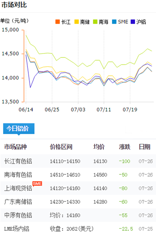 鋁錠價格今日鋁價2018-7-26