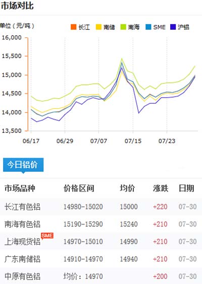 鋁錠價格今日鋁價2020-07-30