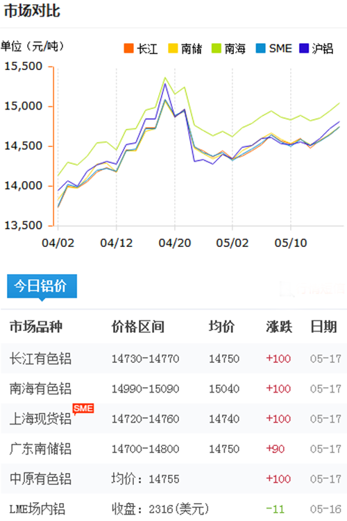 鋁錠價格今日鋁價2018-5-17
